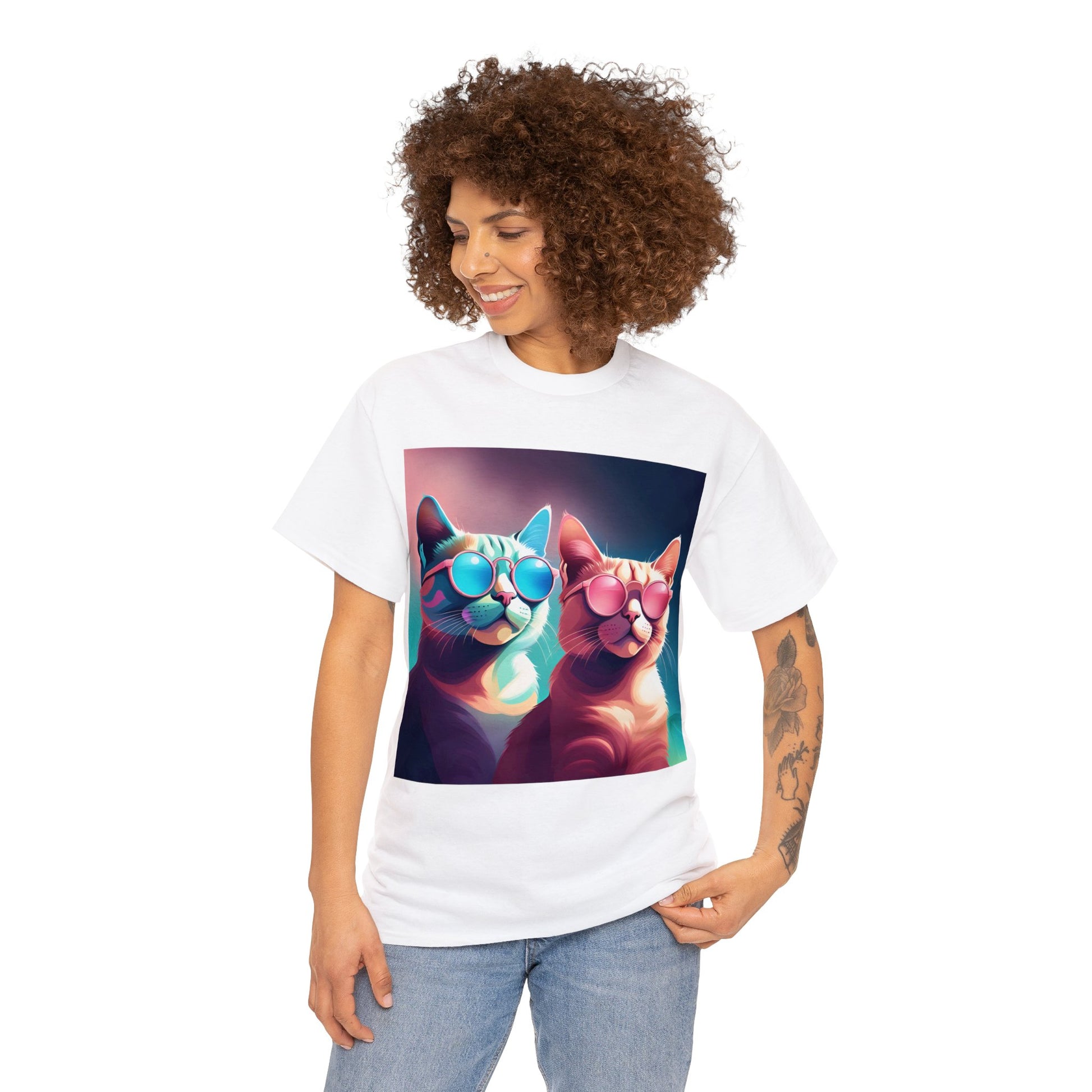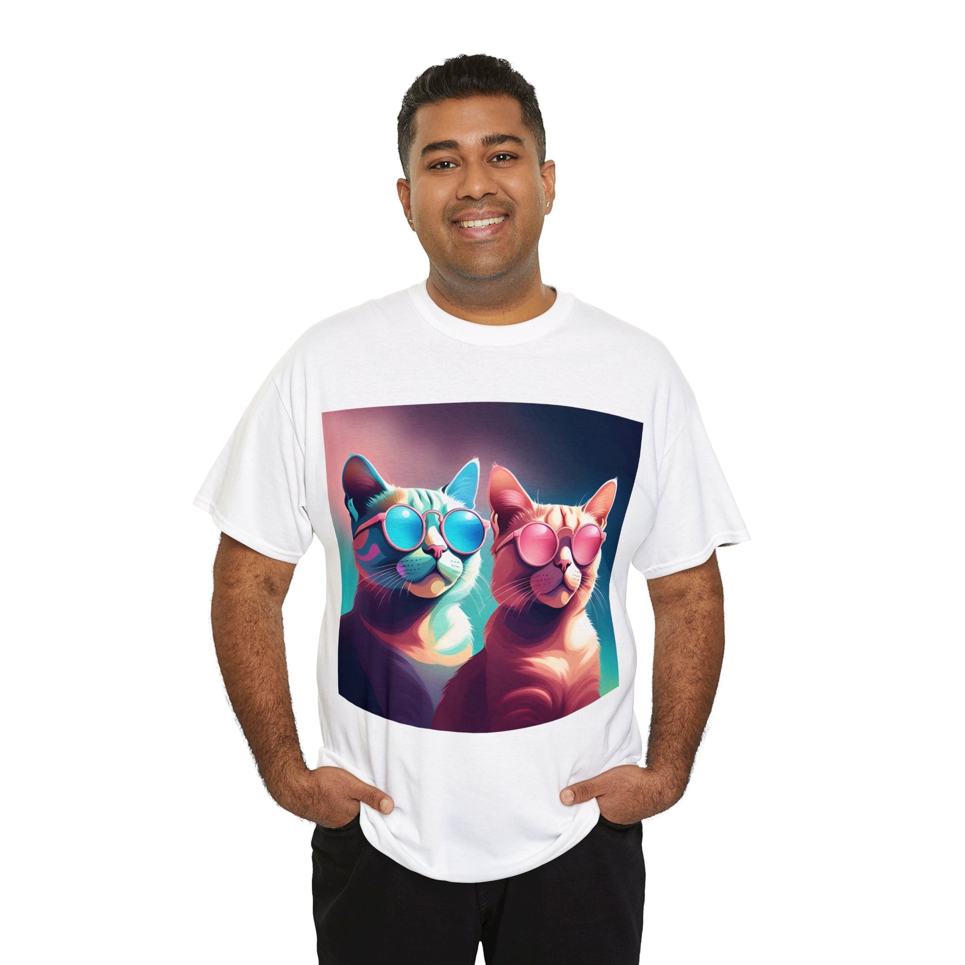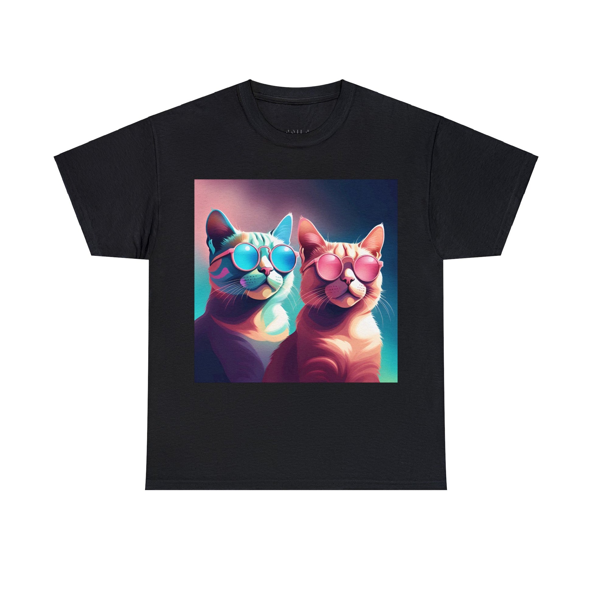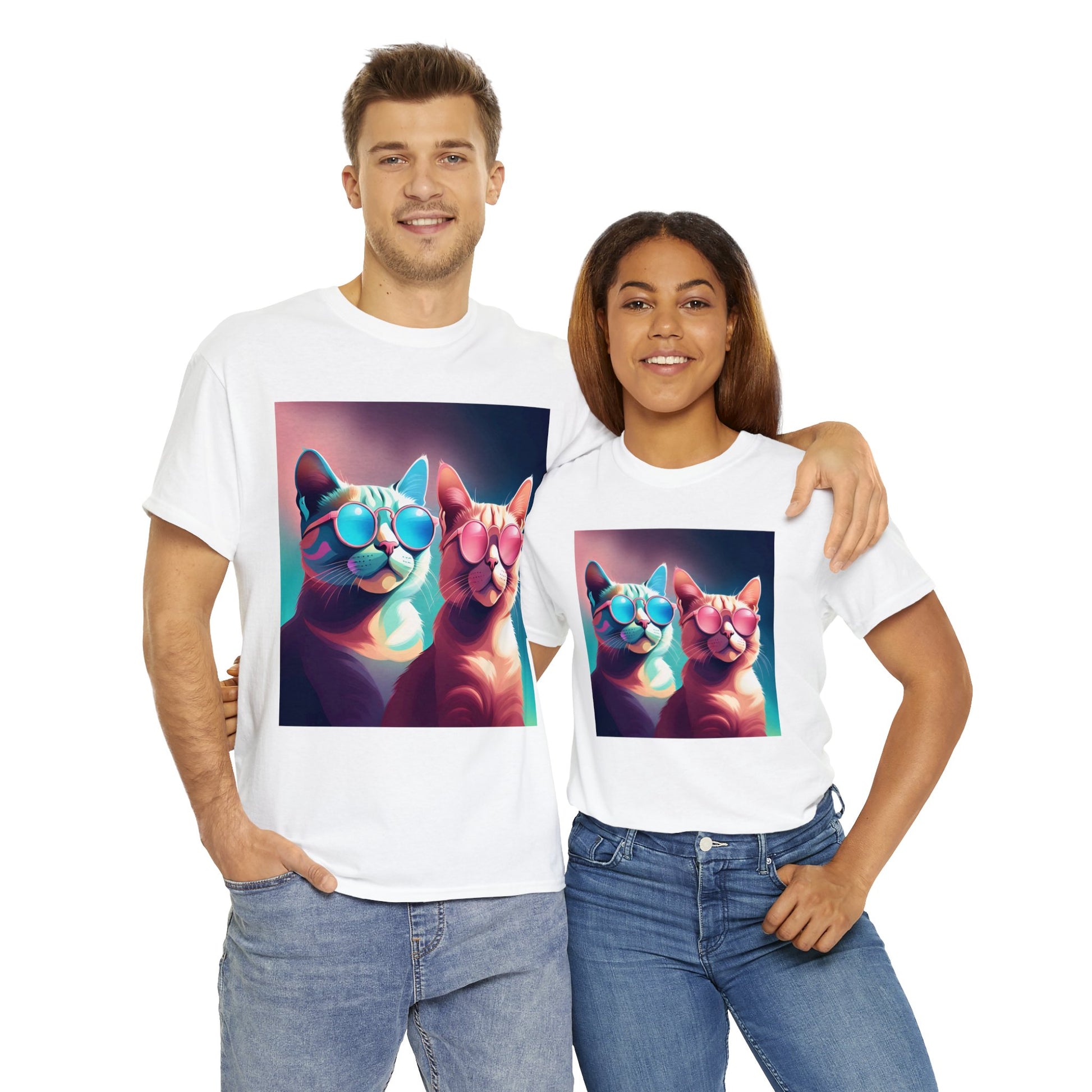 🐾 Whiskers and Shades: Our "Shades of Whiskers" tee features two adorable feline friends, donned in stylish blue, white, and pink hues, rocking the coolest sunglasses in town. It's a quirky and fashionable statement for cat lovers.
