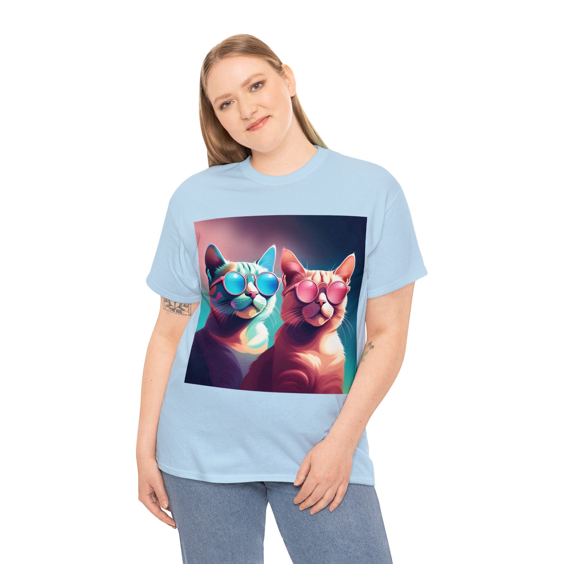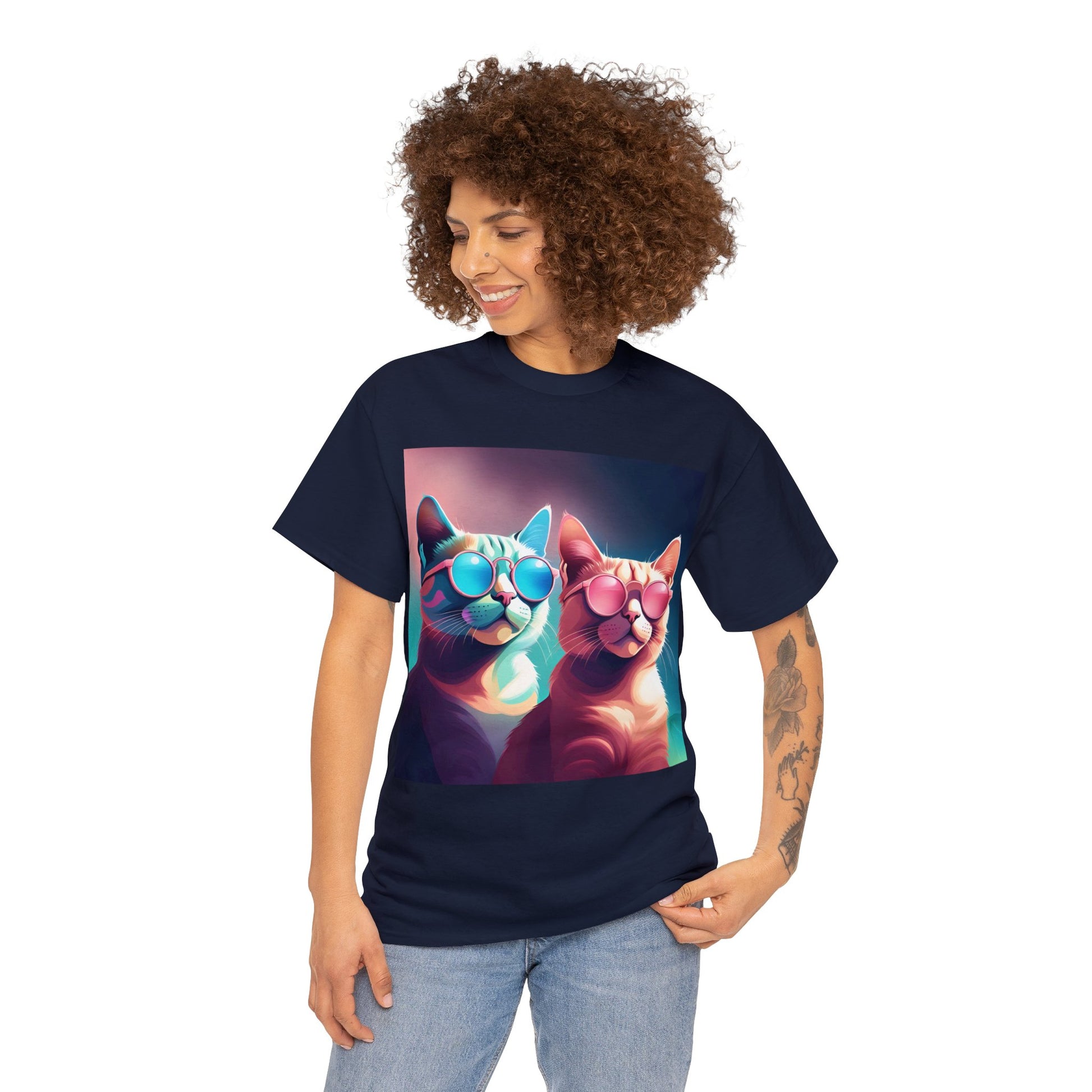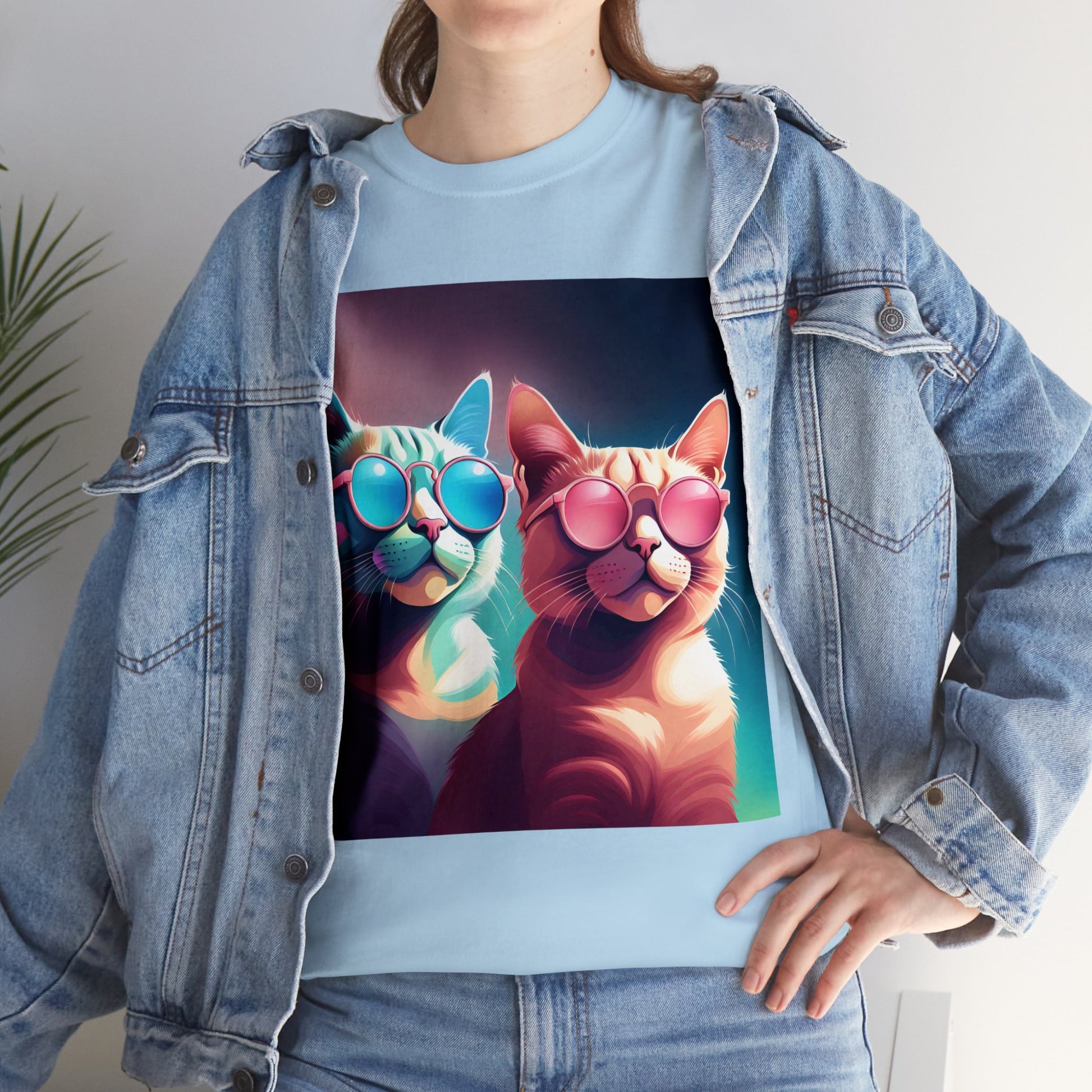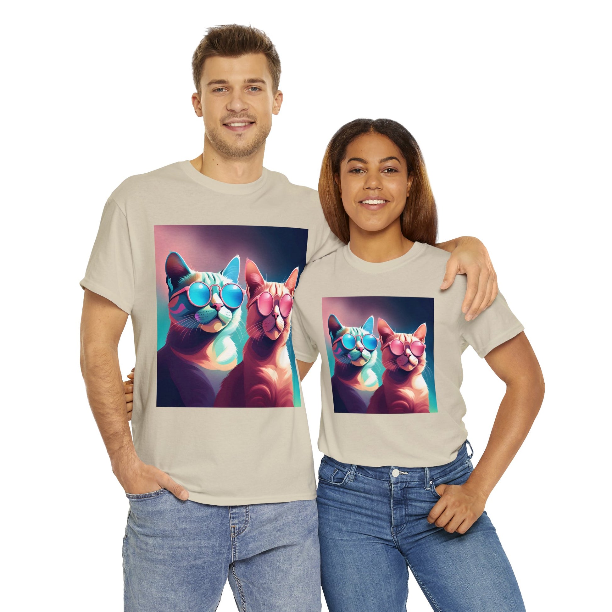 🐾 Whiskers and Shades: Our "Shades of Whiskers" tee features two adorable feline friends, donned in stylish blue, white, and pink hues, rocking the coolest sunglasses in town. It's a quirky and fashionable statement for cat lovers.