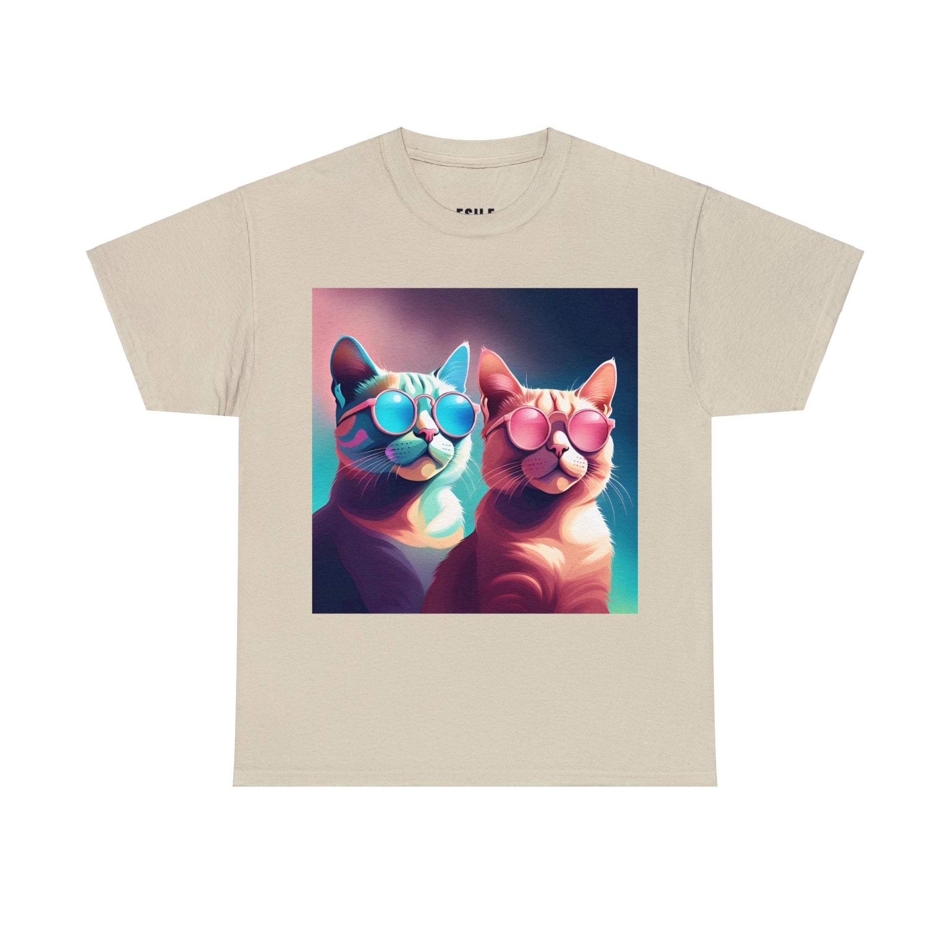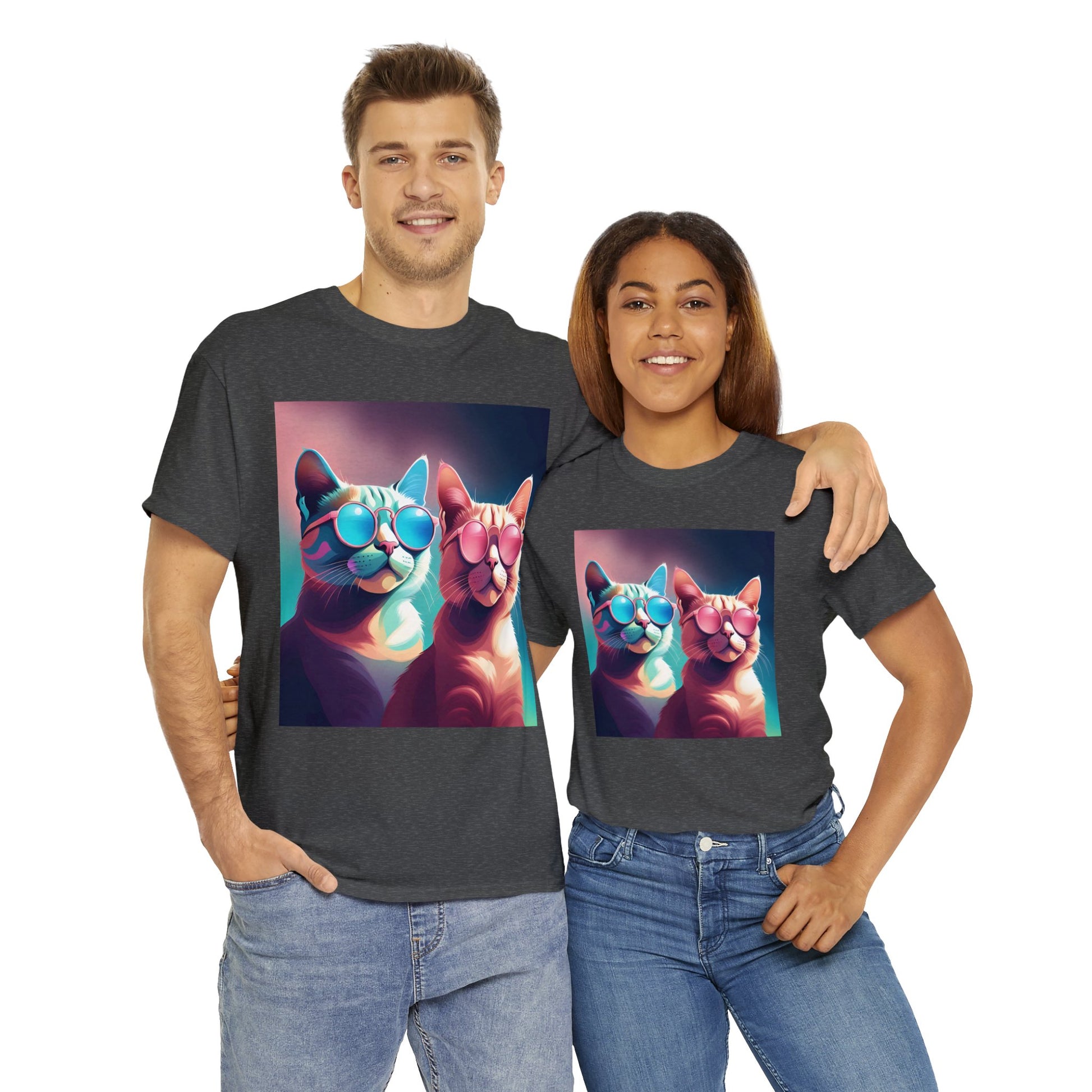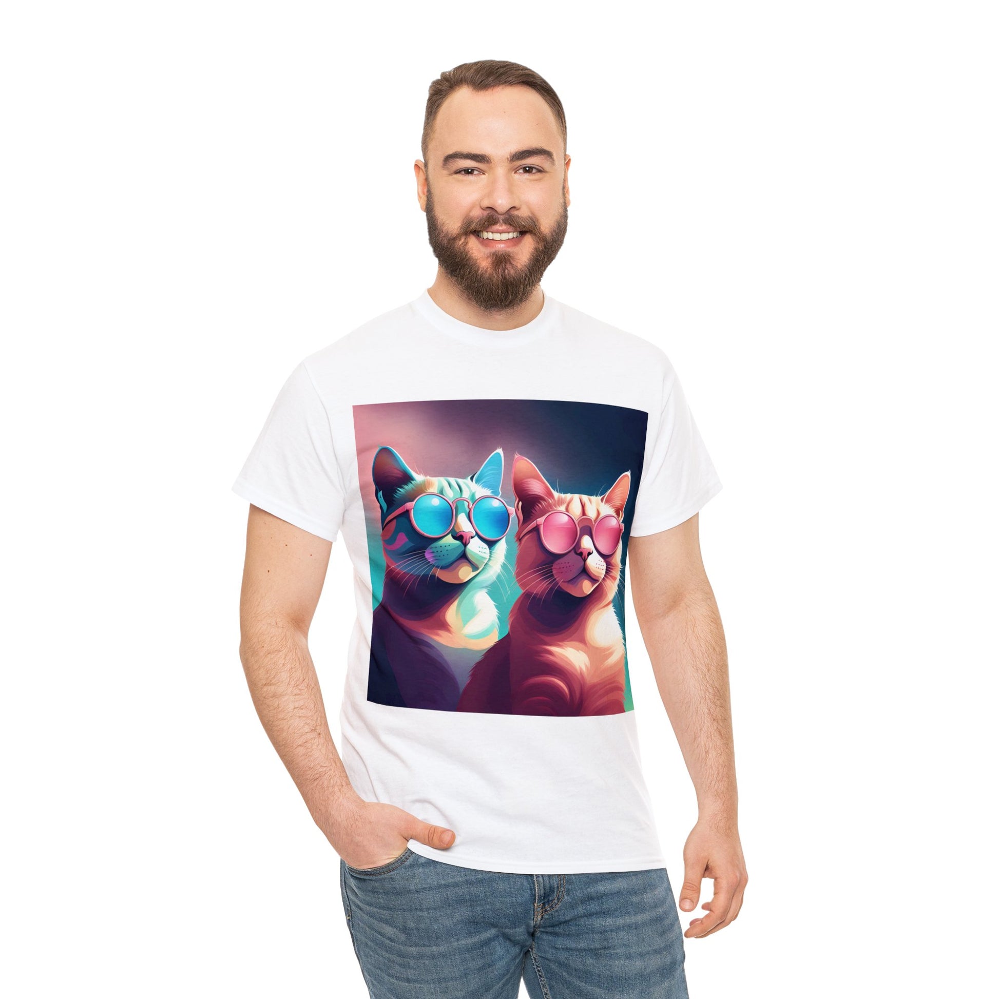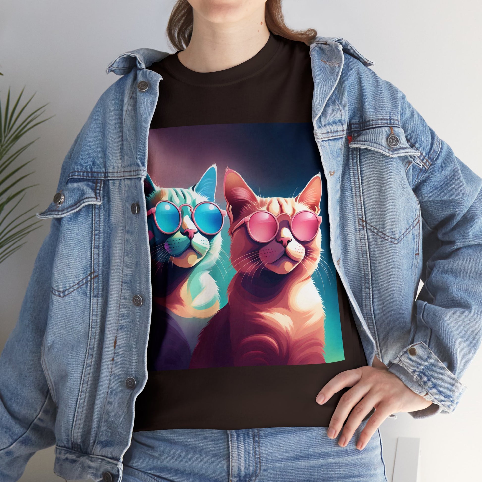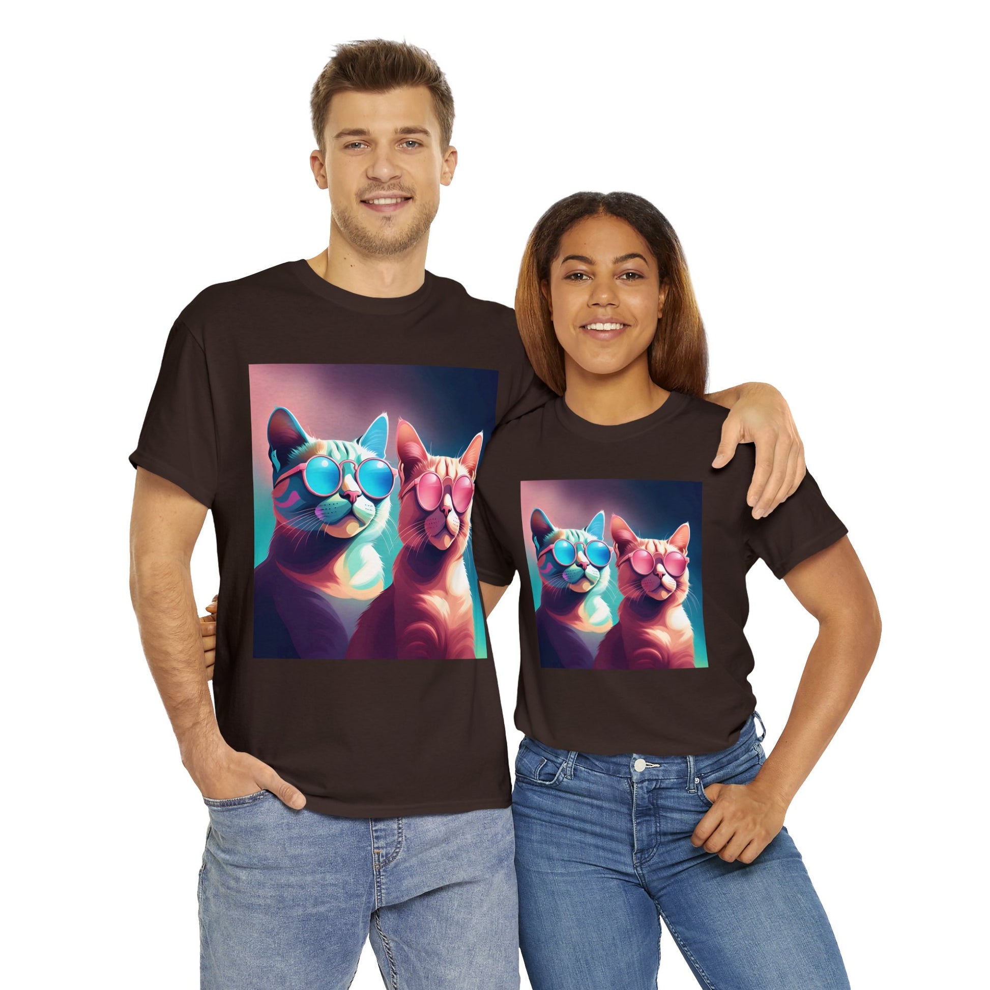 🐾 Whiskers and Shades: Our "Shades of Whiskers" tee features two adorable feline friends, donned in stylish blue, white, and pink hues, rocking the coolest sunglasses in town. It's a quirky and fashionable statement for cat lovers.