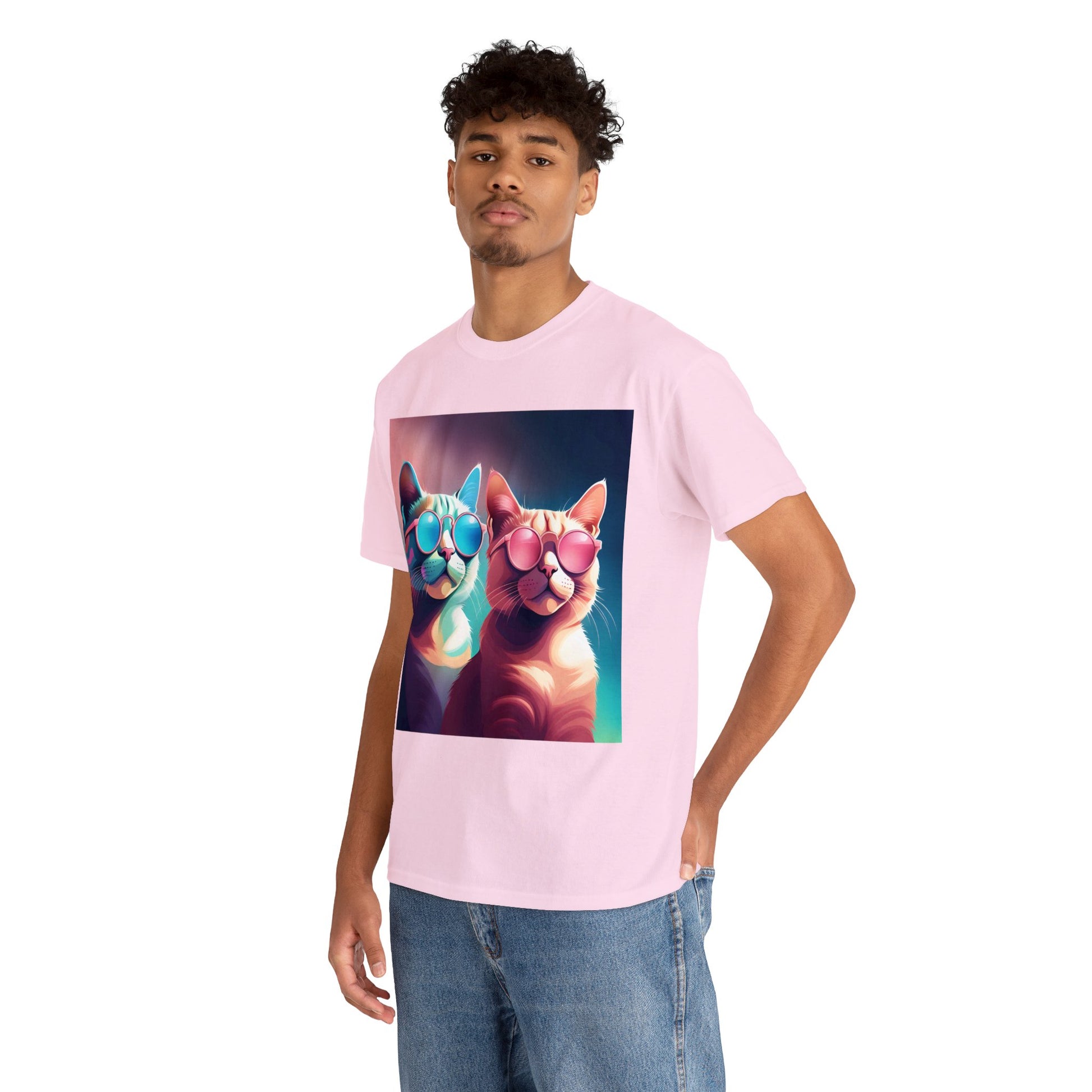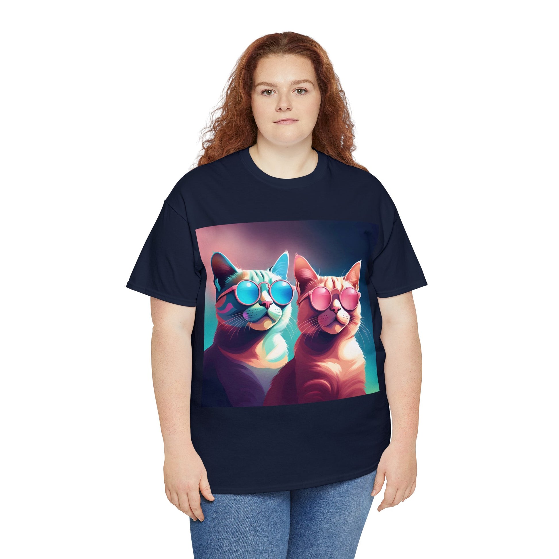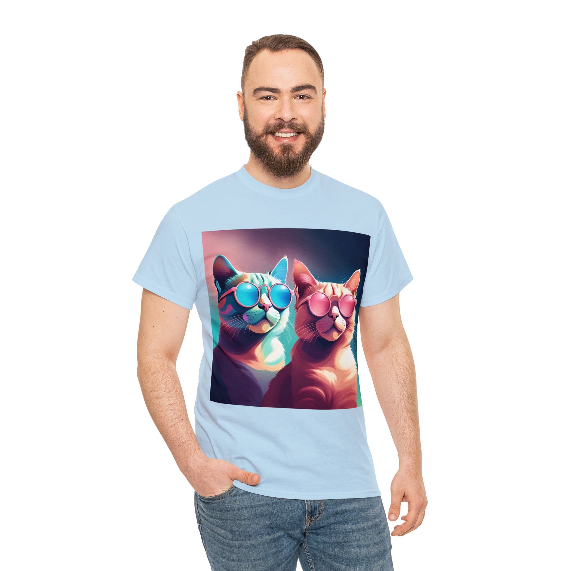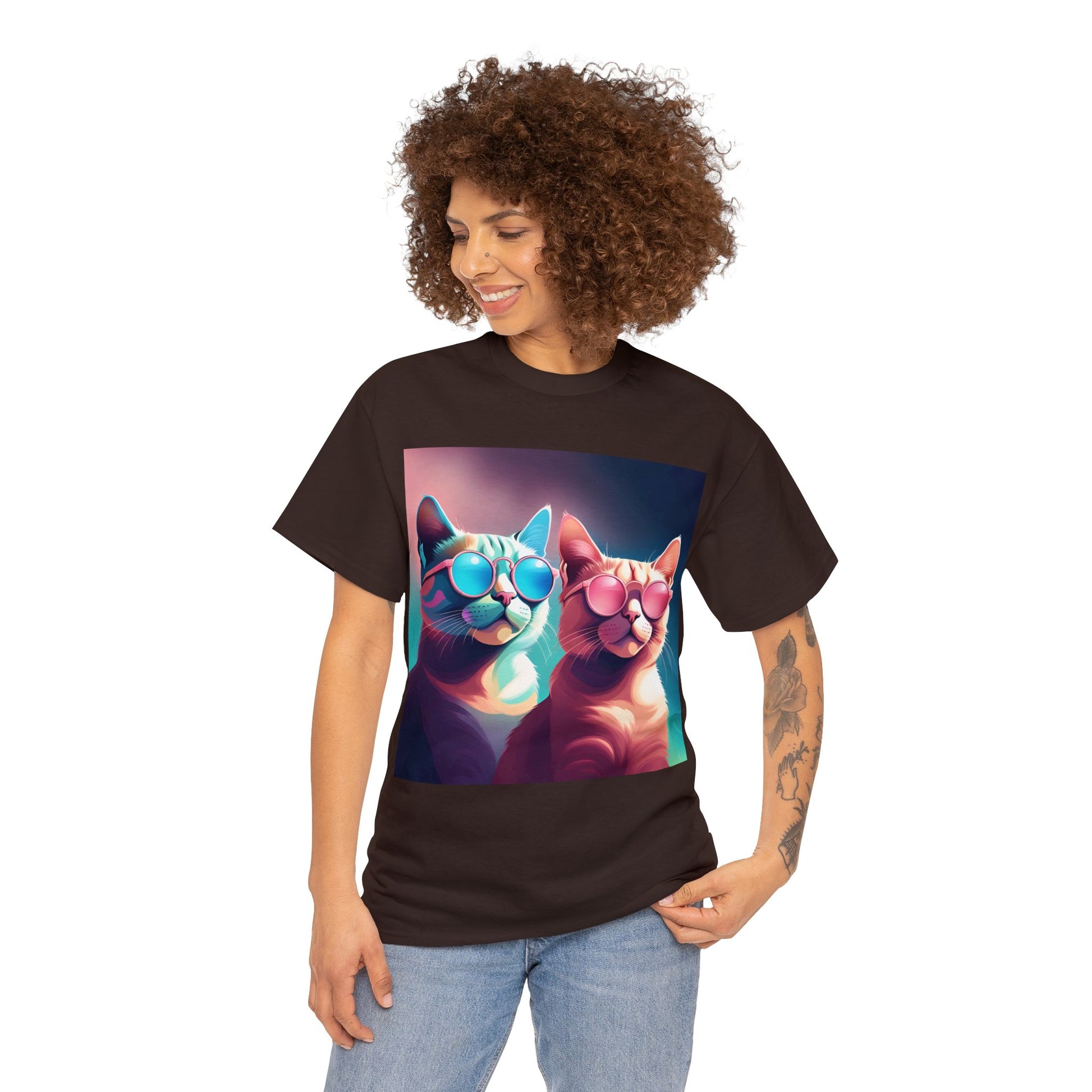 🐾 Whiskers and Shades: Our "Shades of Whiskers" tee features two adorable feline friends, donned in stylish blue, white, and pink hues, rocking the coolest sunglasses in town. It's a quirky and fashionable statement for cat lovers.