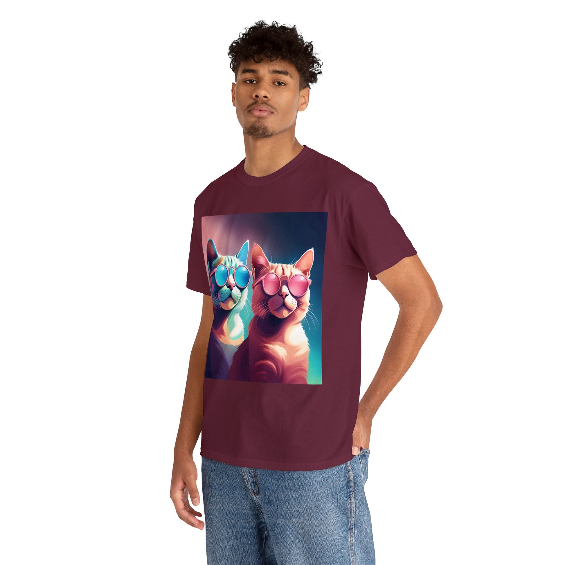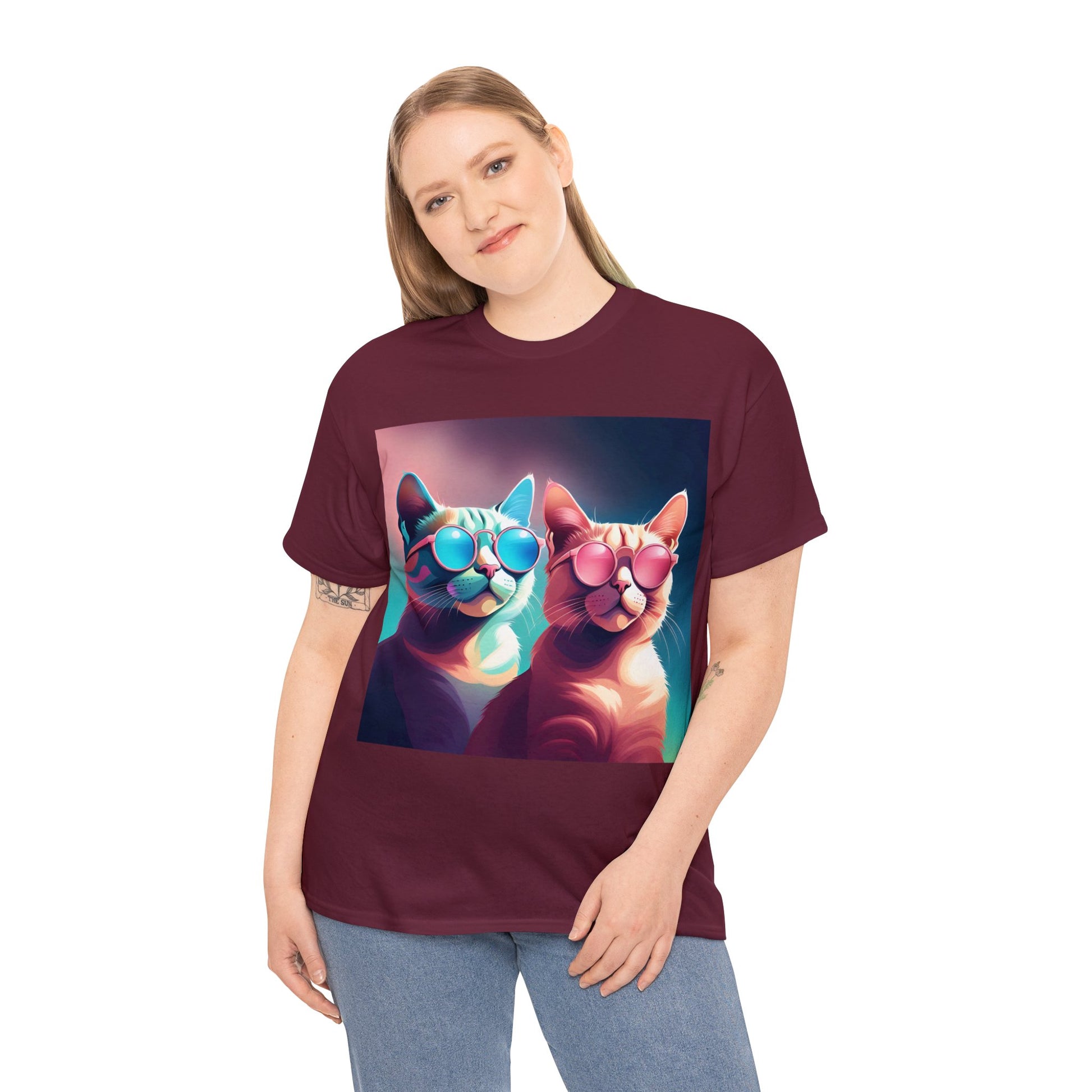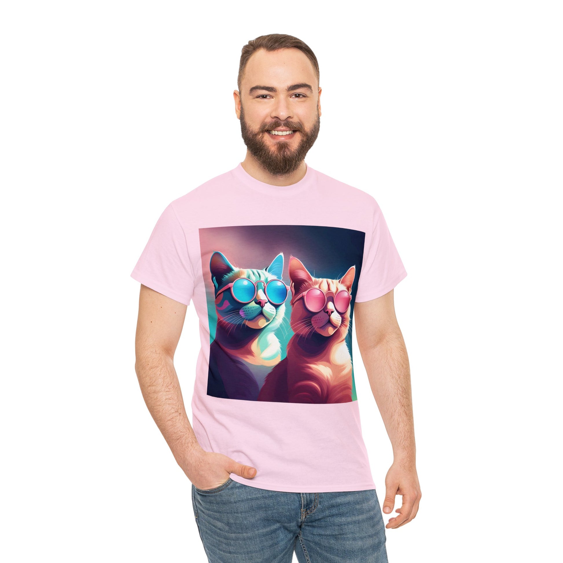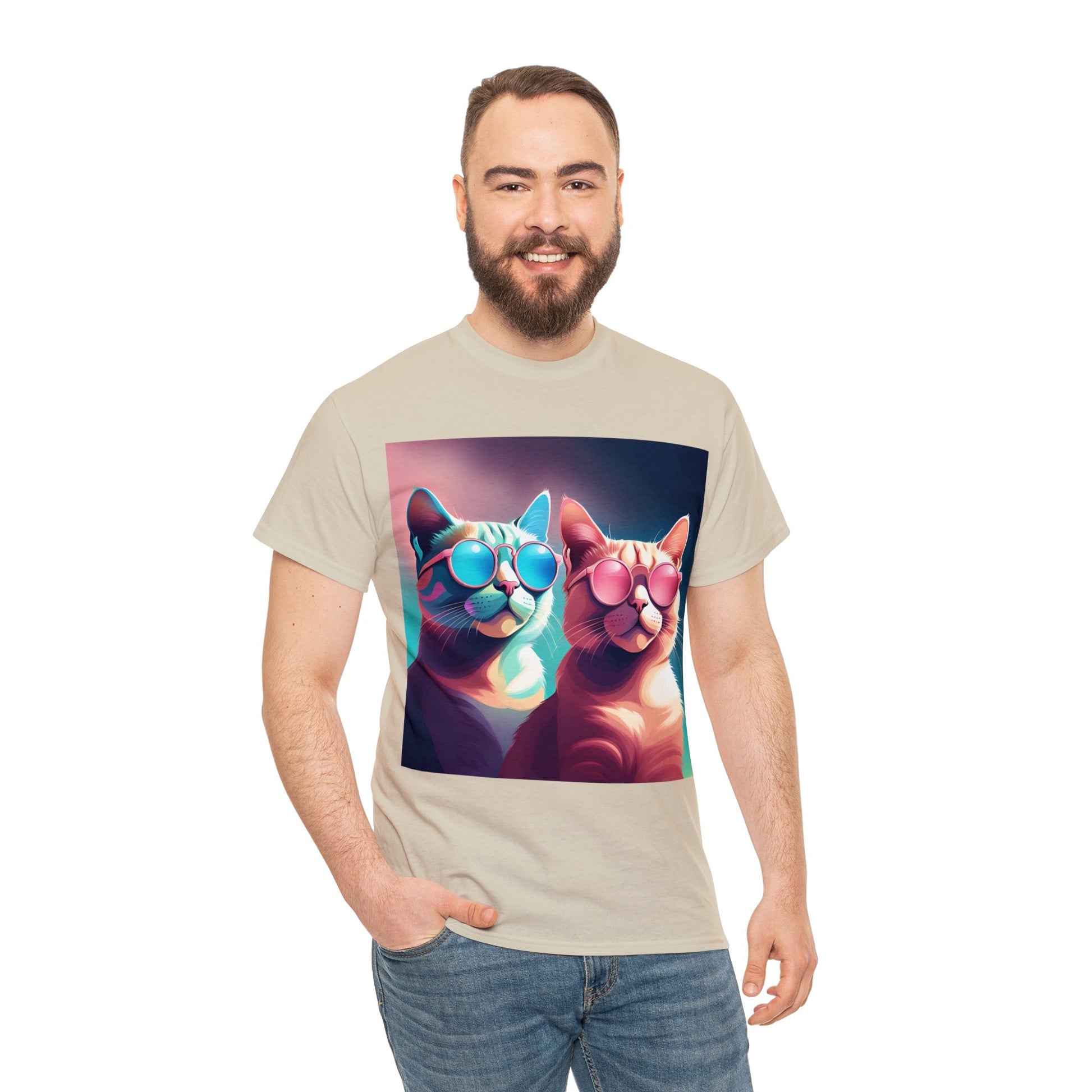 🐾 Whiskers and Shades: Our "Shades of Whiskers" tee features two adorable feline friends, donned in stylish blue, white, and pink hues, rocking the coolest sunglasses in town. It's a quirky and fashionable statement for cat lovers.